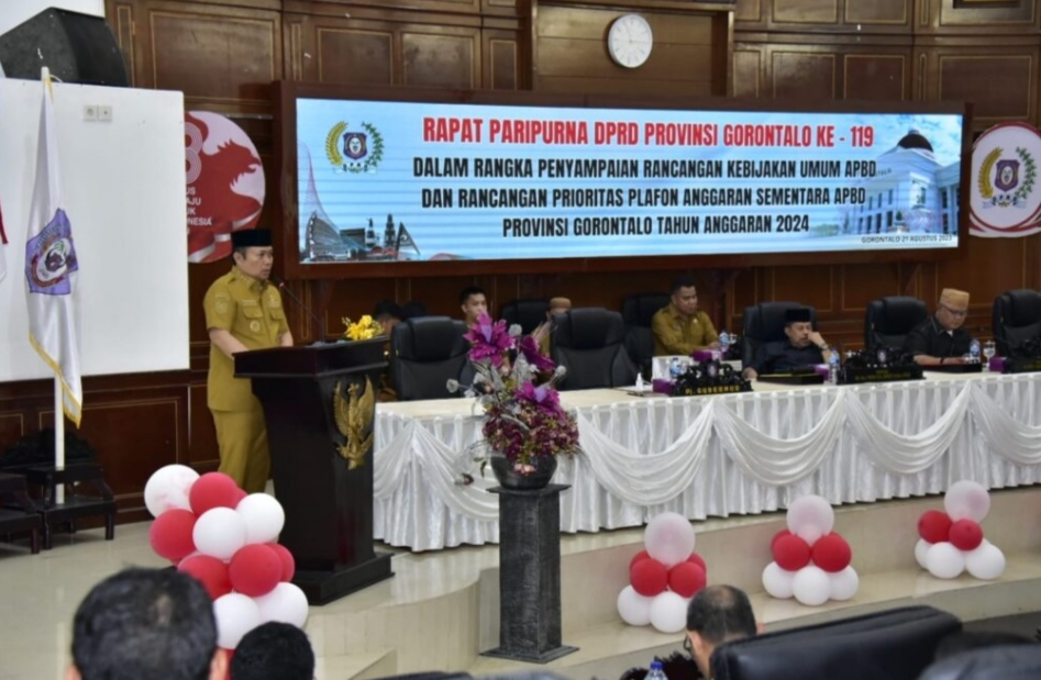 GORONTALO [kabarpublik.id] – Penjabat Gubernur Gorontalo Ismail Pakaya menyampaikan, Rancangan Kebijakan Umum Anggaran-Prioritas dan Plafon Anggaran Sementara (KUA-PPAS) APBD Provinsi Gorontalo Tahun Anggaran 2024 kepada DPRD Provinsi Gorontalo, pada rapat paripurna istimewa DPRD ke-119, Senin (21/8/2023). Melalui kesempatan tersebut diketahui APBD tahun 2024 diproyeksikan naik sebesar 1,14 persen.