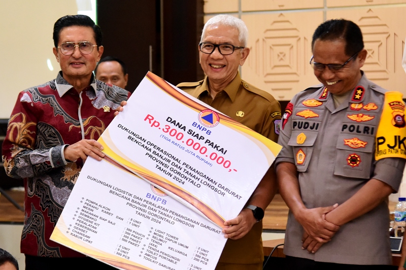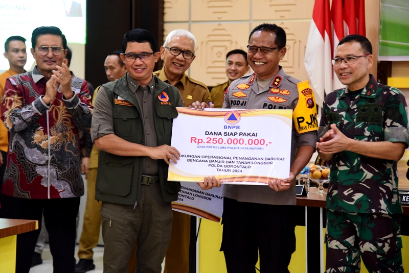 Bantuan berupa Dana Siap Pakai (DSP) tunai serta dukungan logistik dan peralatan itu, diserahkan langsung oleh Kepala BNPB, Letjen TNI Suharyanto, di aula rumah jabatan Gubernur Gorontalo, Selasa (16/7/2024).