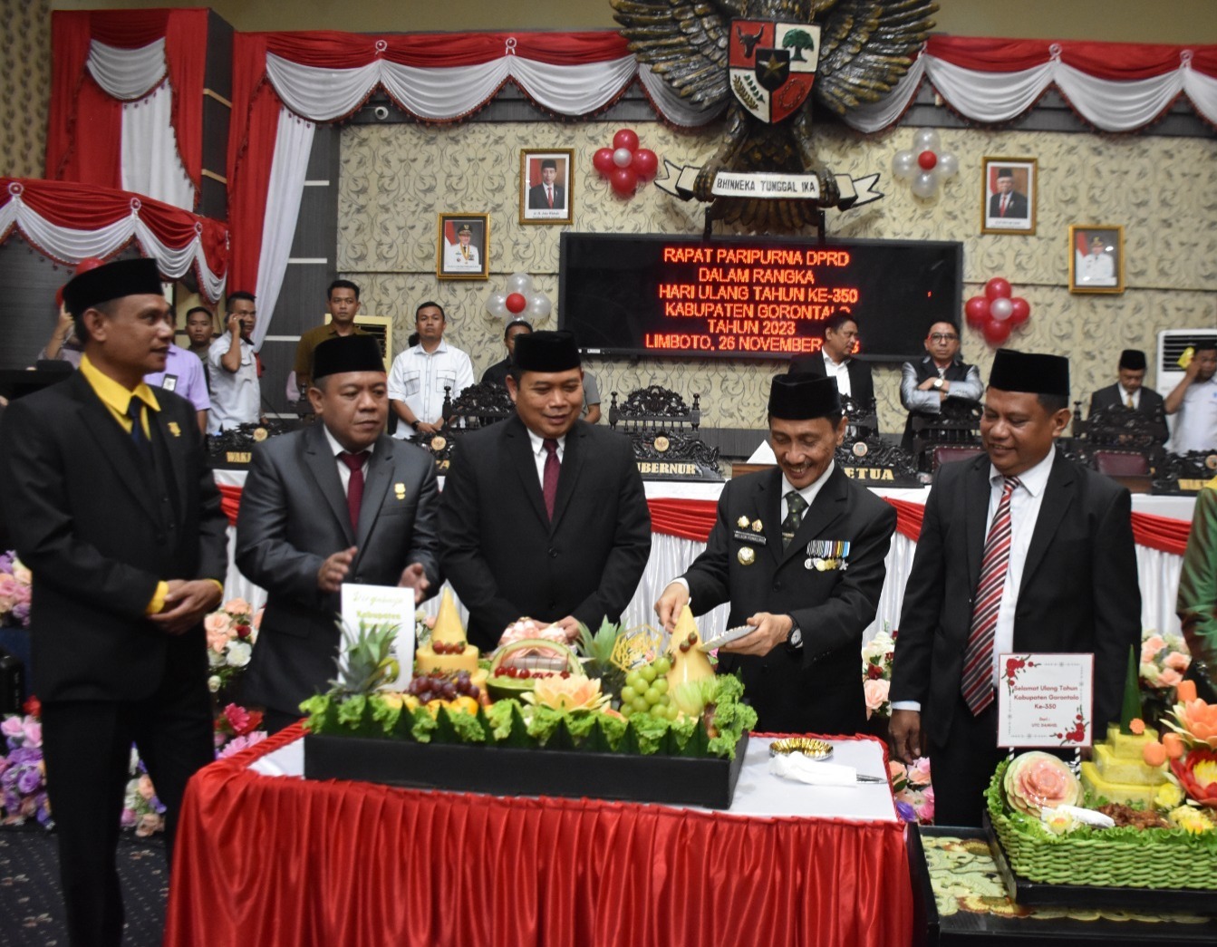 ”Seiring dengan bergantinya waktu, hari, bulan dan bergantinya tahun tidak terasa Kabupaten Gorontalo telah berusia tiga setengah abad, dimana pada hari ini tanggal 26 November 2023, Kabupaten Gorontalo tepat berusia 350 tahun. 350 tahun adalah rentang panjang perjalanan karena penuh dengan romantika dan dinamika sejarah,” ujar Bupati Gorontalo Prof. Nelson, dalam sambutannya pada Sidang Paripurna peringatan HUT ke-350 Kabupaten Gorontalo, Minggu (26/11/2023).