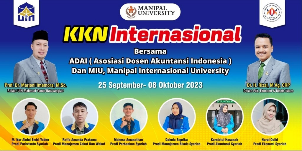 Sementara itu, Dekan FEBI Dr. H. Rizal, M.Ag., CRP, KKN Internasional yang akan di ikuti mahasiswa FEBI UIN Mahmud Yunus Batusangkar ini atas kerjasama dengan Asosiasi Dosen Akuntansi Indonesia (ADAI) dan Manipal Internasional Uinversity (MIU) yang dilaksanakan secara Blended learning dari 25 September – 08 Oktober 2023 dengan bertemakan “KKN Internasional Lintas Kampus Lintas Prodi, dan Lintas Ilmu”