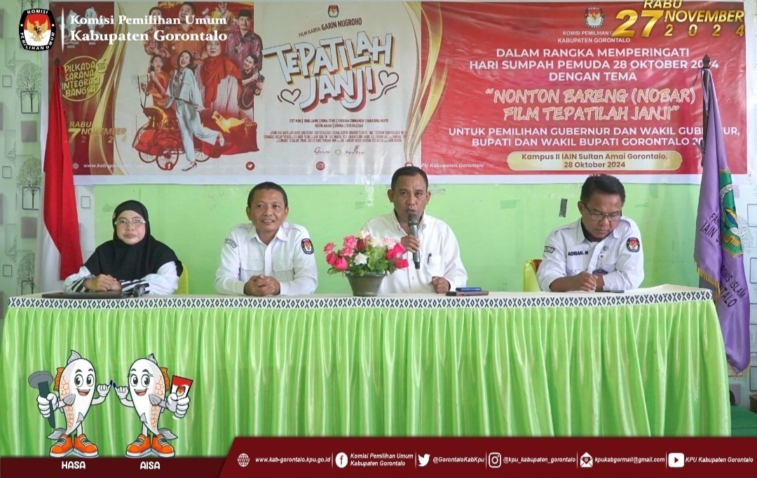 GORONTALO [kabarpublik.id] – KPU Kabupaten Gorontalo kembali melaksanakan sosialisasi tahapan Pemilihan Kepala Daerah (Pilkada) 2024 melalui pemutaran film berjudul “Tepatilah Janji” di aula Kampus IAIN Sultan Amai Gorontalo, pada Senin (28/10/2024).