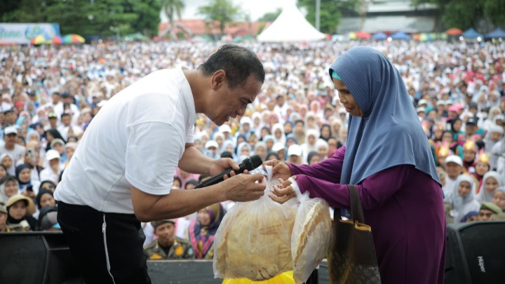 Di tengah ribuan warga, Mentan Amran menyapa masyarakat dan mendengarkan langsung kondisi ekonomi mereka. Perhatiannya tertuju pada seorang pedagang kerupuk yang mengaku berpenghasilan sekitar Rp200 ribu per hari untuk menghidupi tujuh anak.