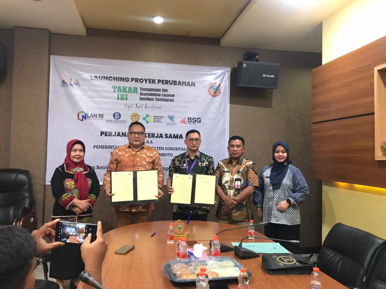 Penandatangan di lakukan di kantor BSG Cabang Limboto yang di hadiri oleh Penjabat Sekda Kabupaten Gorontalo, Haris Suparto Tome. Kegiatan ini juga dirangkaikan dengan launching proyek perubahan dengan tema Transparansi dan Akuntabilitas Layanan Retribusi Terintegrasi (Takar Isi), Kamis,(22/8/2024).