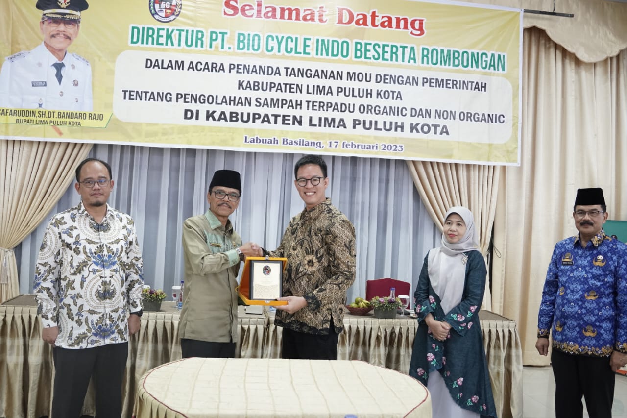 SUMBAR[kabarpublik.id] — Pengelolaan sampah menjadi salah satu permasalahan yang kerap kali ditemui di sejumlah daerah bahkan menjadi permasalahan nasional. Untuk menjawab permasalahan tersebut, Pemerintah Kabupaten Limapuluh Kota bersama PT.Bio Cycle Indonesia berkomitmen menuntaskan permasalahan sampah melalui kerjasama pengolahan sampah terpadu organik dan non organik. Komitmen Itu ditandai dengan penandatangan Naskah Kerja Sama keduanya oleh Bupati Limapuluh Kota Safaruddin Datuk Bandaro Rajo dan Direktur Utama PT.Bio Cycle Indonesia Budi Tanaka di pendopo rumah dinas bupati, Labuah Basilang, Jum’at (17/02/2023).