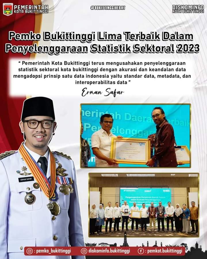 SUMATERA BARAT [kabarpublik.id] – Wali Kota Bukittinggi, Erman Safar terima penghargaan Penyelenggaraan Statistik Sektoral Terbaik 2023 atas hasil Evaluasi Penyelenggaraan Statistik Sektoral (EPSS) pada instansi Pusat dan Pemerintah Daerah Tahun 2023. Penghargaan ini diserahkan langsung oleh BPS Sumbar di The Balcone Hotel, Rabu, 6 Desember 2023.