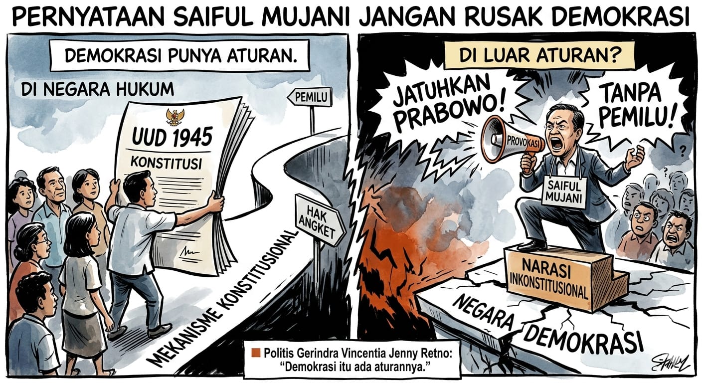 JAKARTA (kabarpublik.id) – Politisi Gerindra Vincentia Jenny Retno melontarkan kritik tajam terhadap pernyataan Saiful Mujani yang dinilai mengarah pada ajakan inkonstitusional untuk menjatuhkan Presiden Prabowo Subianto.
