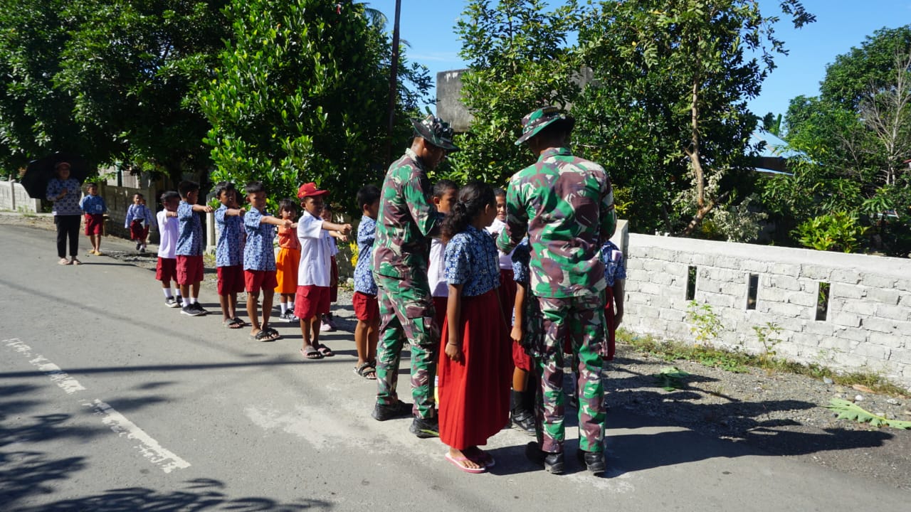 Personil Satgas TMMD Ke 121 Kodim 1509/Labuha Melatih Anak Anak yang akan mengikuti acara lomba gerak jalan tingkat Sekolah dasar, Latihan tersebut meliputi Peraturan Baris Berbaris (PBB) yang baik dan benar,