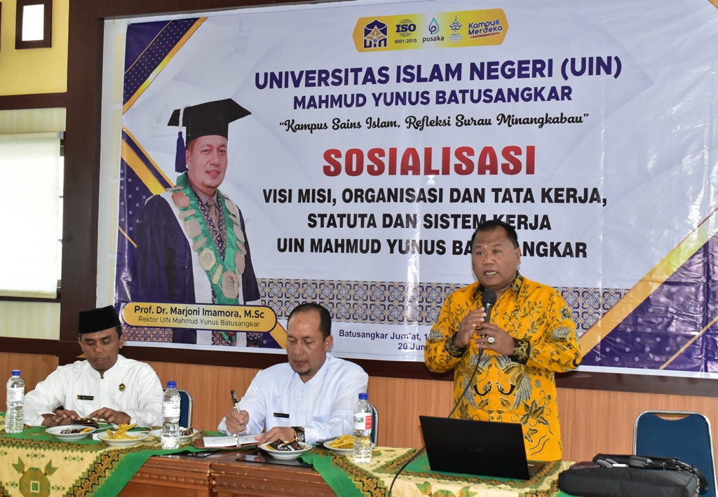 Untuk memicu dan memacu energi sumber daya manusia pada Universitas Islam Negeri (UIN) Mahmud Yunus Batusangkar, Rektor Prof. Dr. Marjoni Imamora, M.Sc buka sosialisasi Visi Misi, Sosialisasi PMA 75 tahun 2022 tentang Ortaker UIN MY Batusangkar dan Sosialisasi KMA 1179 tahun 2022 tentang Sistem Kerja.