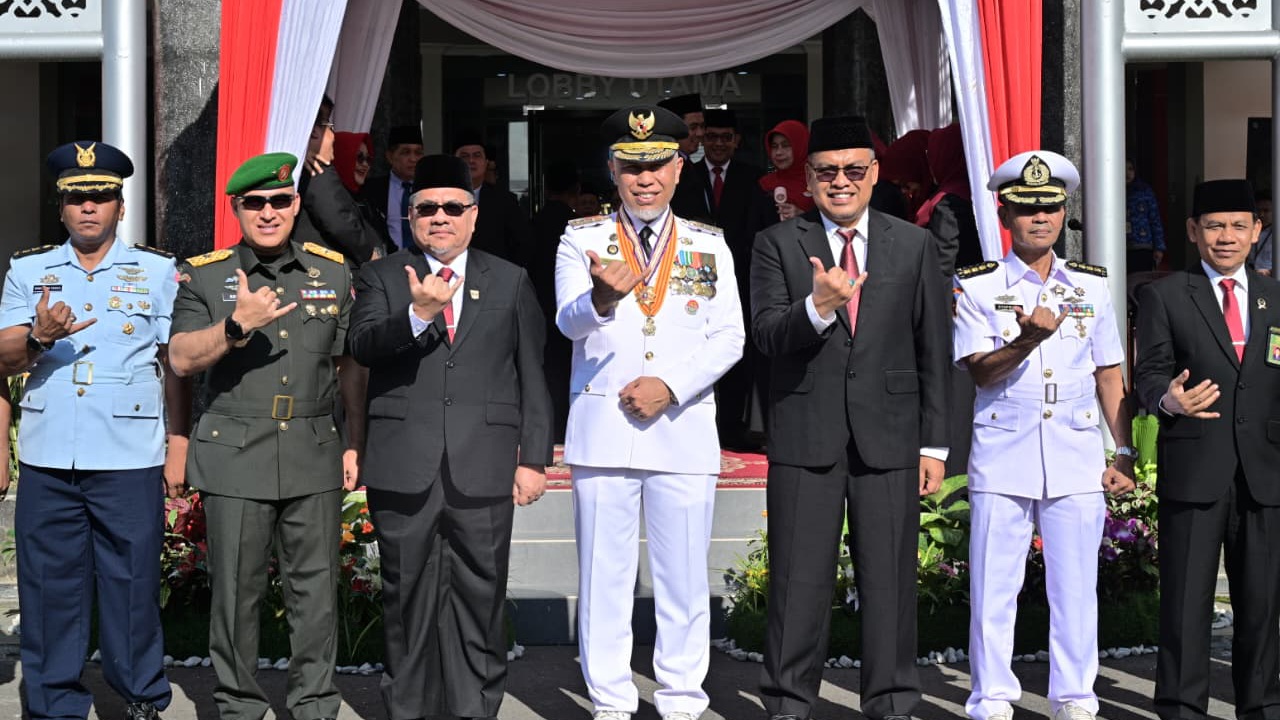 Gubernur Mahyeldi bersama jajaran Forkopimda Sumbar setelah kegiatan upacara peringatan Hari Otonomi Daerah ke-30 yang digelar di halaman Kantor Gubernur, Senin (27/4/26). (Sumber: Pemprov Sumbar)