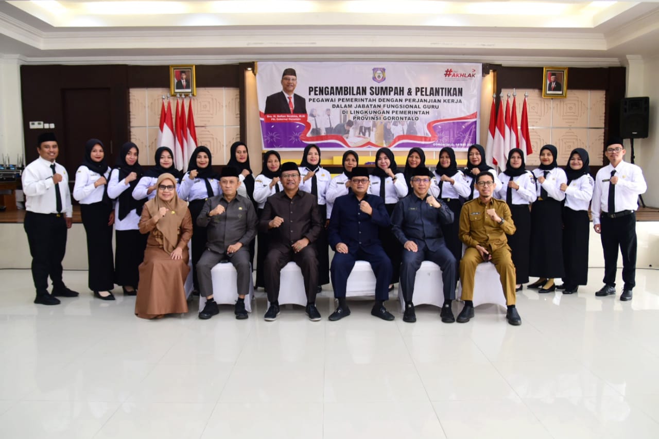“Saya pelaksana harian Gubernur Gorontalo dengan ini secara resmi melantik saudara saudari sebagai Pegawai Pemerintah dengan Perjanjian Kerja dalam jabatan fungsional guru di lingkungan Pemerintah Provinsi Gorontalo,” ucap Sofian saat membacakan naskah pelantikan.