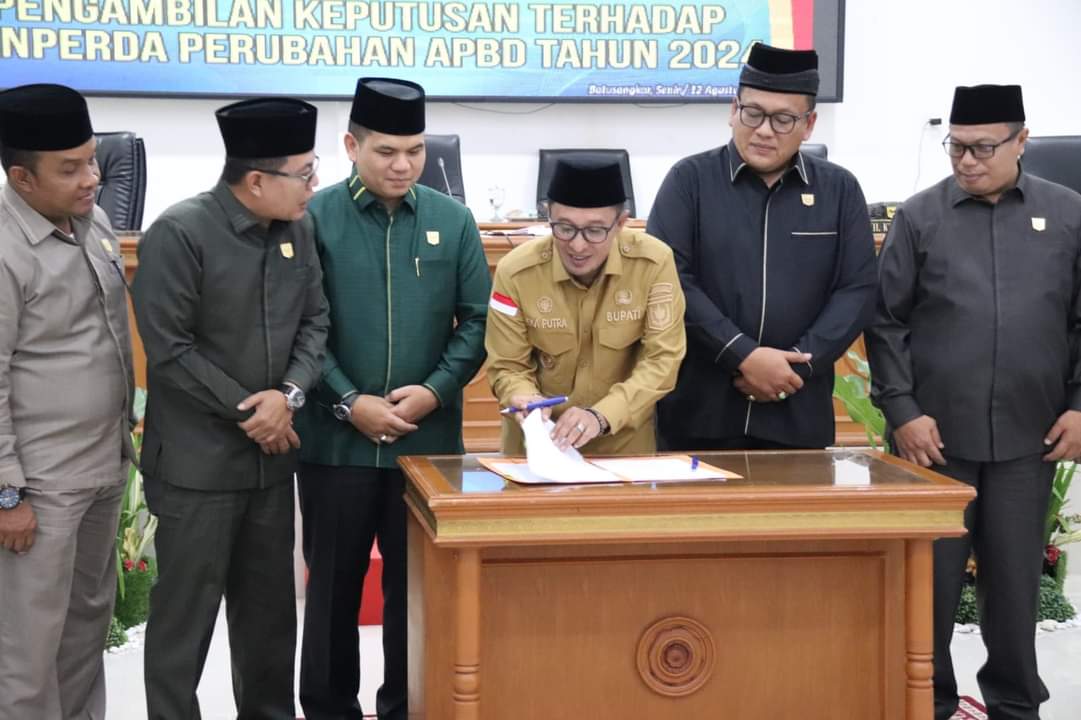 “Alhamdulillah, setelah melalui rangkaian proses pembahasan Rancangan Peraturan Daerah tentang Perubahan APBD Tahun Anggaran 2024, kemarin masing-masing fraksi telah menyampaikan pendapat akhir atas Ranperda tentang Perubahan APBD Tahun Anggaran 2024 dan hari ini kita tanda tangani bersama berita acara persetujuannya,” sampainya.