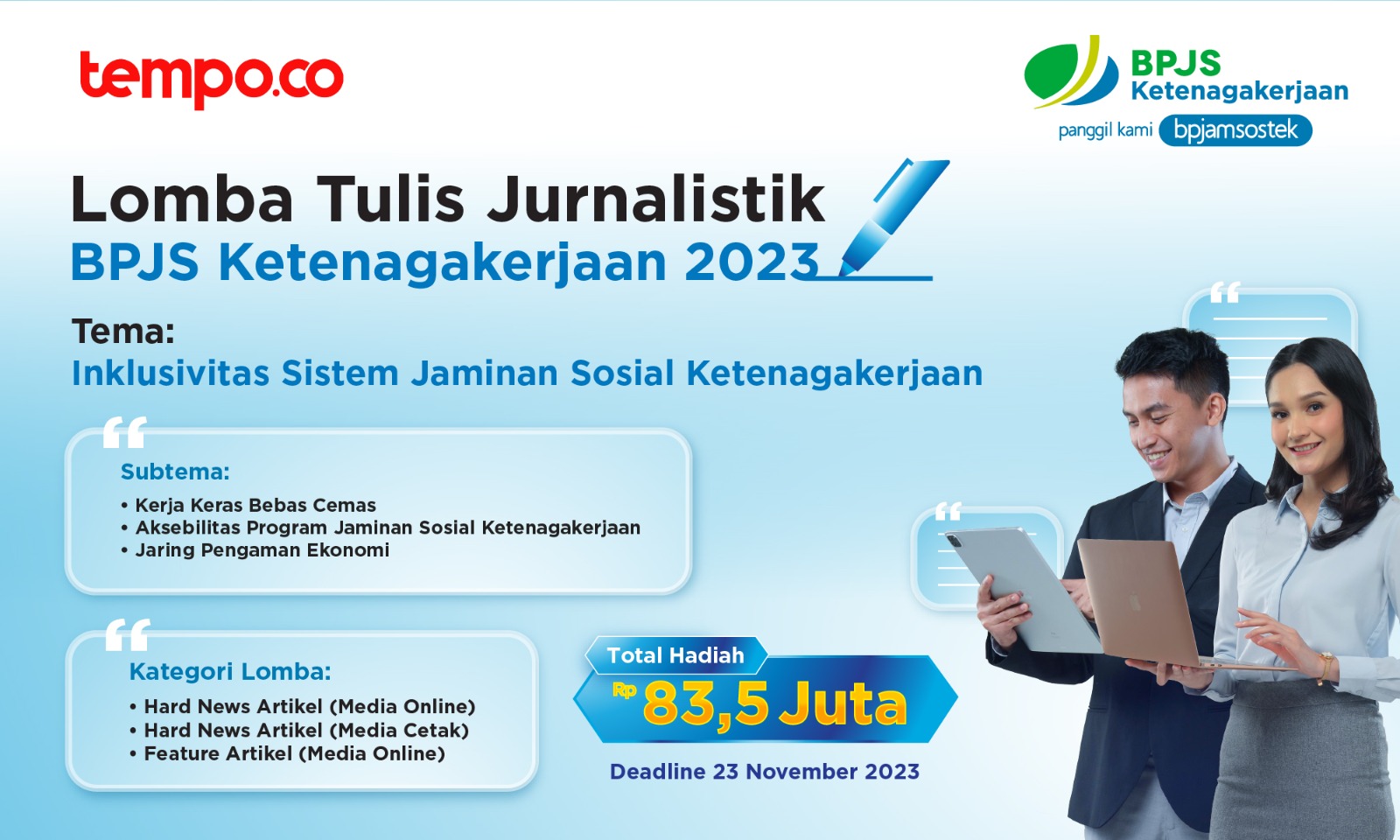 Seperti tahun sebelumnya, kategori lomba terbagi menjadi 3 yaitu kategori yaitu Hard News Artikel (media online), Hard News Artikel (media cetak), dan Future Artikel (media online). Setiap kategori akan dipilih tiga karya terbaik. Periode perlombaan akan dimulai sejak 12 Oktober hingga 27 November 2023, dan artikel yang dapat diikutsertakan yaitu artikel yang telah tayang dari 1 Juni – 27 November 2023. Kabar baiknya adalah setiap jurnalis dapat mengirimkan 5 karya, namun tetap hanya 1 yang berhak untuk menjadi pemenang. Adapun tautan pendaftaran sebagai berikut: https://microsite.tempo.co/lomba-jurnalistik-bpjs/.
