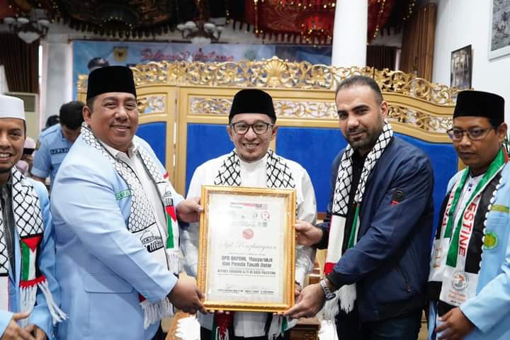 Piagam penghargaan untuk masyarakat Tanah Datar yang telah menginfakan dan menyedekahkan hartanya untuk membantu rakyat Palestina diterima langsung oleh Bupati Tanah Datar Eka Putra, SE, MM Senin (25/3/2024) di Indojolito Batusangkar.