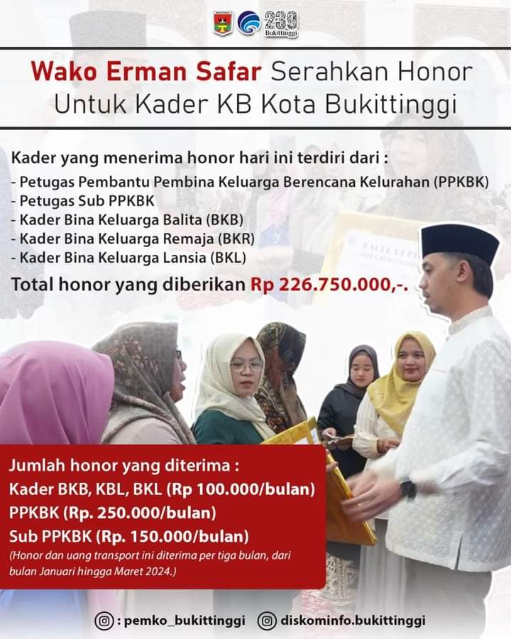 SUMATERA BARAT [kabarpublik.id] – Pemko Bukittinggi melalui Dinas Pemberdayaan Perempuan Perlindungan Anak Pengendalian Penduduk dan Keluarga Berencana (DP3APPKB), berikan advokasi dan KIE Bangga Kencana serta honor kader KB. Kegiatan itu dilaksanakan di balairung rumah dinas wako, Rabu, 27 Maret 2024.